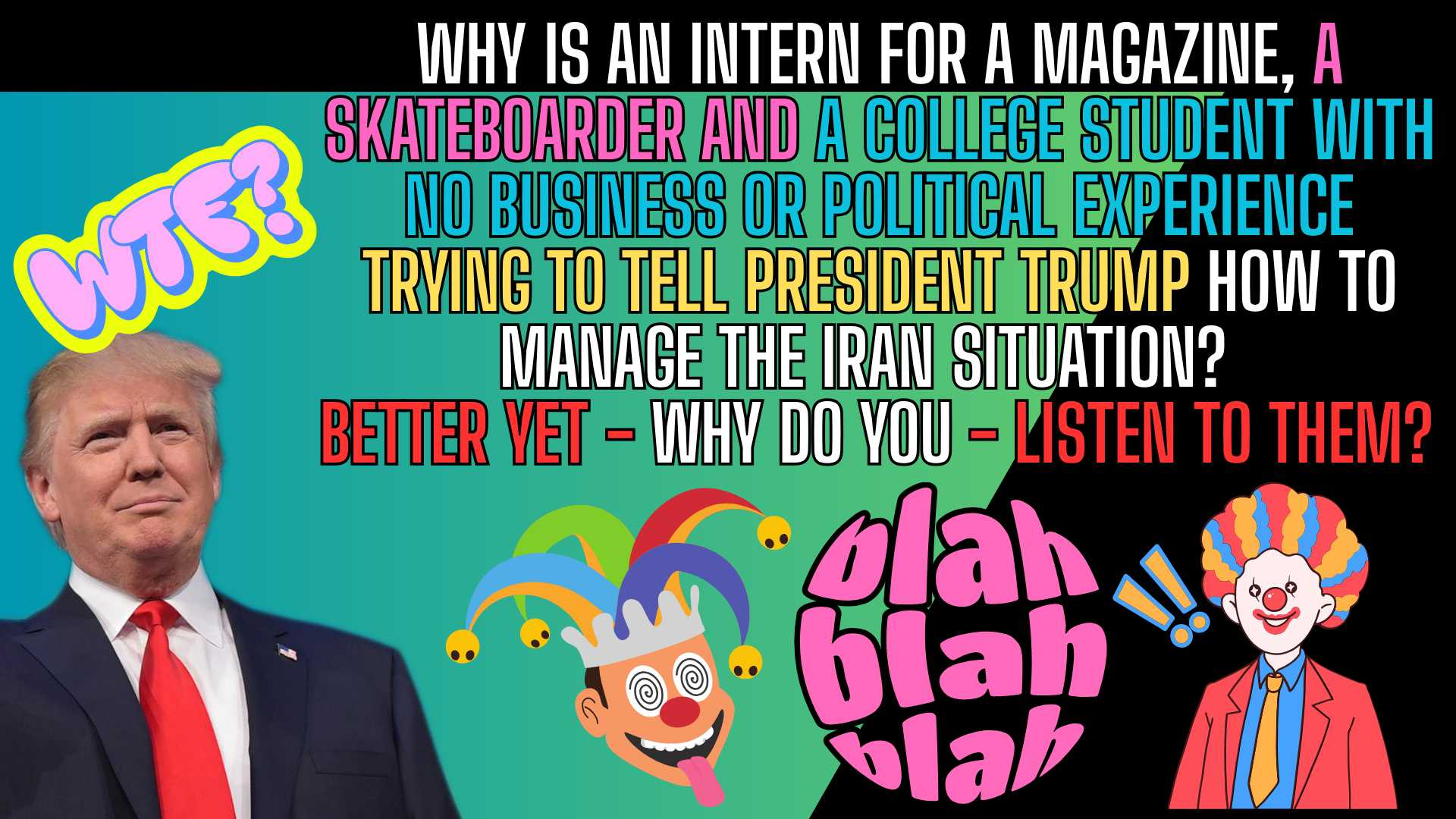 7 PM CST: DO YOU GO TO YOUR GARAGE MECHANIC TO GET A BROKEN TOOTH FIXED? THEN WHY is an intern for a magazine, a skateboarder and a college student with no business or political experience trying to tell President trump how to manage the Iran situation? Better yet - why do you - listen to them?